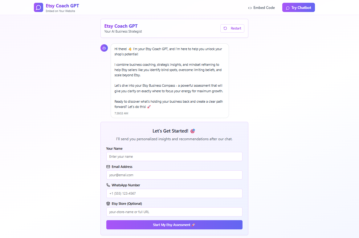 Goal: Build an embeddable Etsy coaching chatbot that feels like a wise mentorβnot a form. It captures name, email, and WhatsApp (with consent), runs a 10-pillar βEtsy Business Compass,β diagnoses strengths/weaknesses, reframes limiting beliefs, and delivers a 90-day plan by email + WhatsApp.